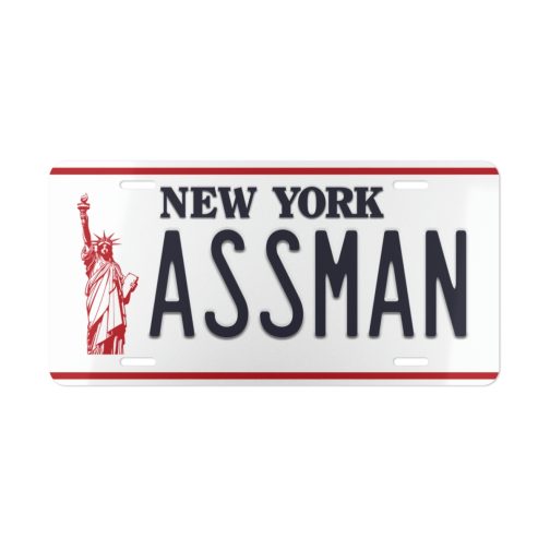 This aluminum license plate features a lovingly recreated ASSMAN New York design — identical to the Proctologist’s plate as seen in the TV show Seinfeld. Please note that this is a PRINTED design, not a belted / pressed plate!