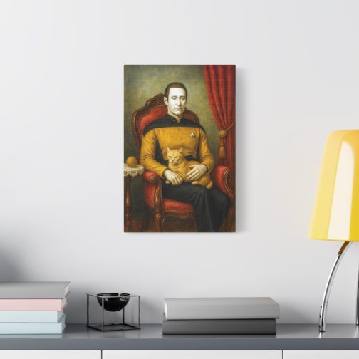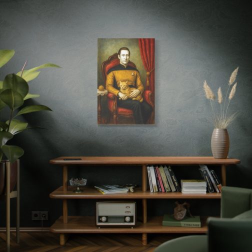 data canvas print, spot the cat, star trek art, sci-fi canvas, commander data artwork, star trek wall decor, tng fan art, fictional corporation print, android and cat, renaissance parody art, geeky wall art, nerd gift