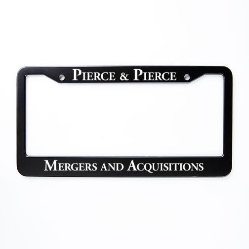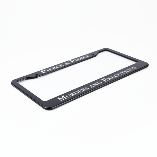 Return some videotapes with a Pierce & Pierce – Mergers and Acquisitions / Murders and Executions license plate frame! Available in black aluminium, as a single license plate holder, or set of two. Get one of each to perfect the illusion, as seen on business cards (and spoken by Patrick Bateman) in the movie!