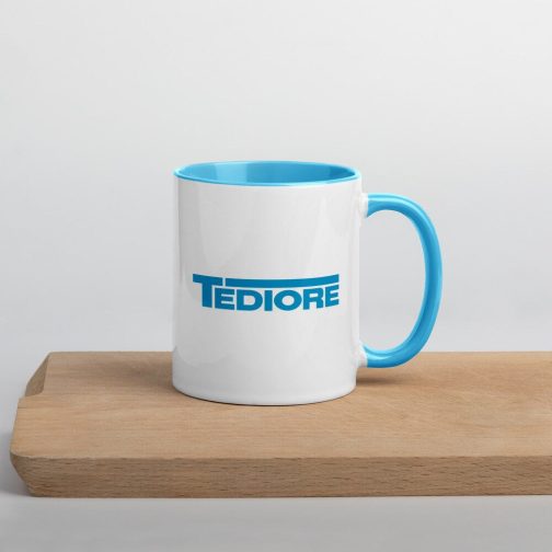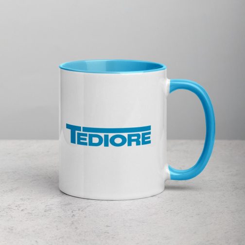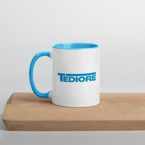 The Tediore logo features on both sides of this cup, which comes in standard cup-sized 11oz (325ml) and has a blue handle and blue inside to match the logo.