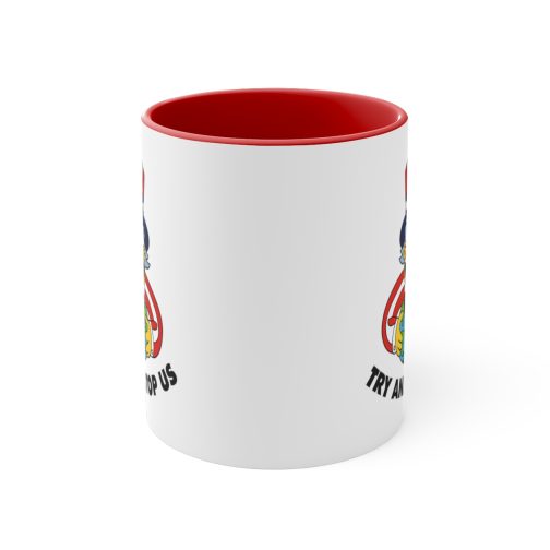 As seen in The Simpsons, the “TRY AND STOP US” design features on both sides of this white mug with red handle and inner accent.